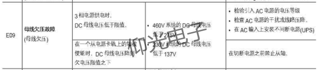 AB伺服驅動器運行中報警顯示E09母線欠壓故障,解決方法:3相電源供電時DC母線電壓低于限值在一個從電源卡軌上的軸被使能時,DC母線電壓降到欠電壓限值之下。